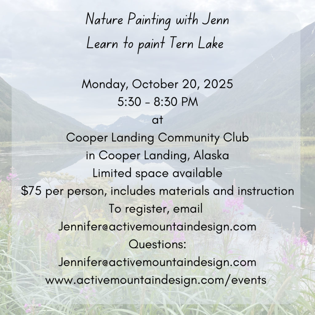 To join this class, email Jennifer at Jennifer@activemountaindesign.com and mention Cooper Landing Painting Class.